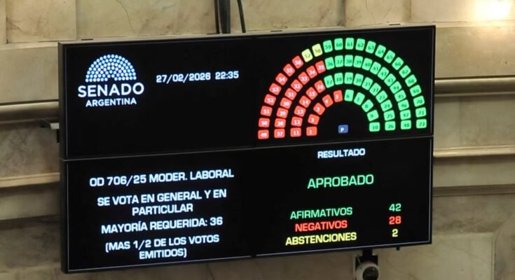El Senado de la Nación Argentina sancionó este viernes la reforma laboral promovida por el presidente Javier Milei, en una sesión atravesada por cuestionamientos de la oposición y advertencias de sectores sindicales. La iniciativa fue aprobada con 42 votos a favor, 28 en contra y dos abstenciones, y se convirtió en ley sobre el cierre del período de sesiones extraordinarias.