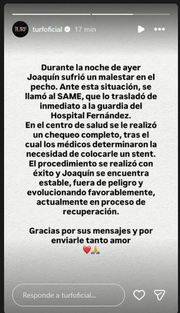 El cantante y líder de la banda Turf, Joaquín Levinton, fue internado de urgencia la madrugada de este viernes tras sufrir un infarto.